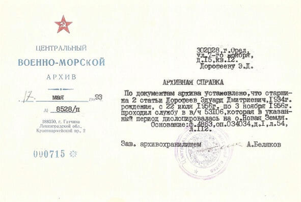 Но вот, что вспоминает Эдуард Дорофеев: «А вот в августе или сентябре пятьдесят шестого наш корабль с какой-то целью возможно о ней знал командир ходил к северной оконечности Новой земли, но не на самый край, а где-то к Маточкину Шару. Там уже сплошные сопки в снегу, безлюдье, однако один посёлок на берегу увидели, и даже побывали там. В местном магазине видел шубу из песцов, и долго её разглядывал, раскрыв рот стоили она десять тысяч рублей, сумма по тем временам великая.