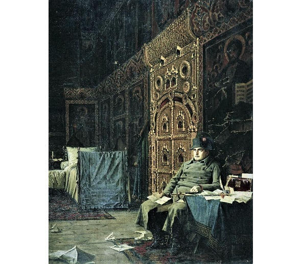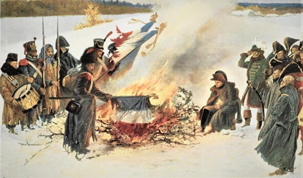 Сожжение знамен «Великой армии». Хромолитография по оригиналу А. Коссака. 1912 г.