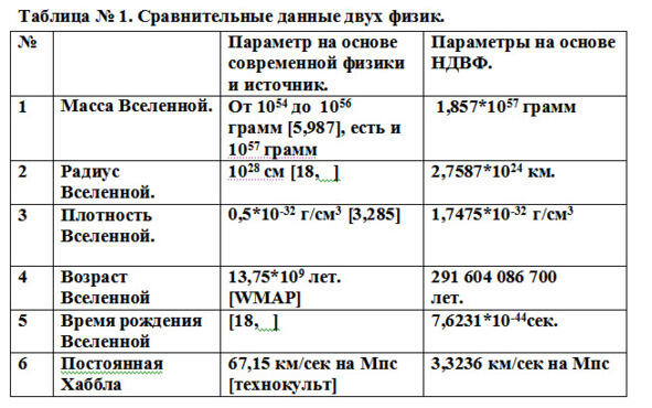 .1. Чтобы видна была разница, между современной физикой и динамической физикой. Привожу принятые числовые данные по Космологии и данные полученные автором на основе динамической физике.