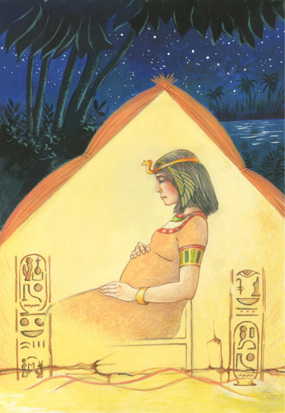 The queen knew that Set would stop at nothing, killing anyone who stood between him and the throne. To protect her unborn child, the rightful heir to the throne, she immediately sought refuge in the marshy delta of the Nile. There she built a small house among thickets of papyrus, far from any people, and she anxiously awaited the birth of the future king.