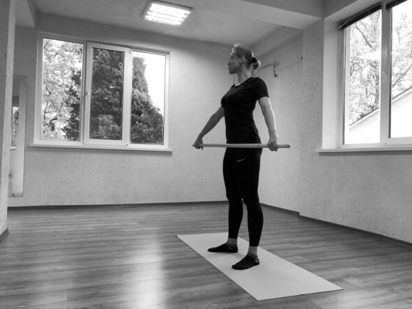 Исходное положение: стоя, ноги на ширине плеч, вирга перед собой в опущенных руках, хват средний верхний.