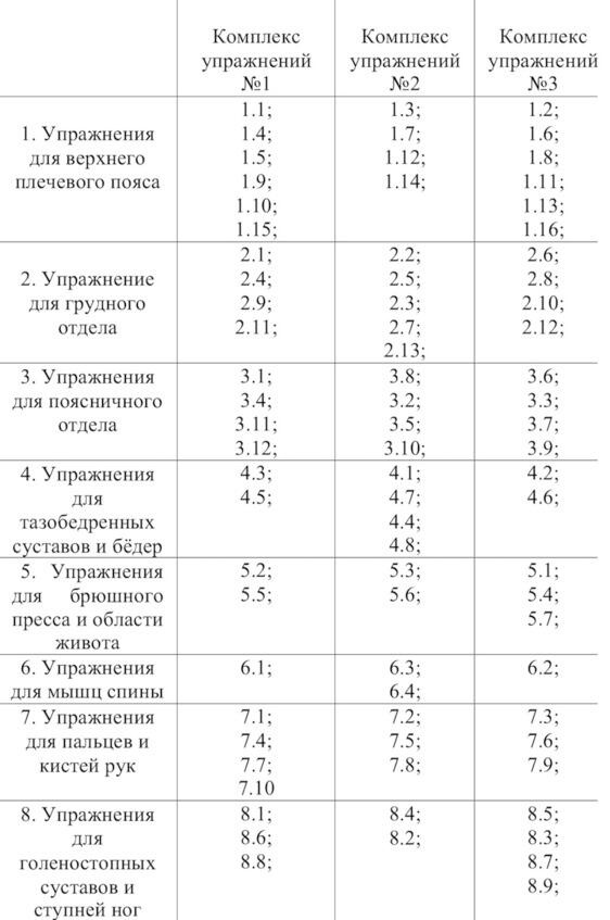 К примеру, Вы хотите найти в книге упражнение К Солнцу. Сначала, в таблице с указанием названий упражнений, Вы находите место расположения искомого упражнения (К Солнцу): Комплекс 1, упражнение 4 (по порядковому номеру сверху вниз). Далее, во второй таблице с указанием числовых обозначений упражнений Вы находите Комплекс упражнений 1 и смотрите числовое обозначение четвёртого упражнения сверху (4 порядковый номер упражнения в первой таблице), которое и соответствует его названию. В данном случае упражнение К Солнцу имеет числовое обозначение 1.9, обозначающее в свою очередь следующее: раздел 1 (Упражнения для верхнего плечевого пояса), порядковый номер упражнения в разделе 9 (1.9. Упражнение 9) (стр. 33). Аналогично осуществляйте поиск и других нужных Вам упражнений.