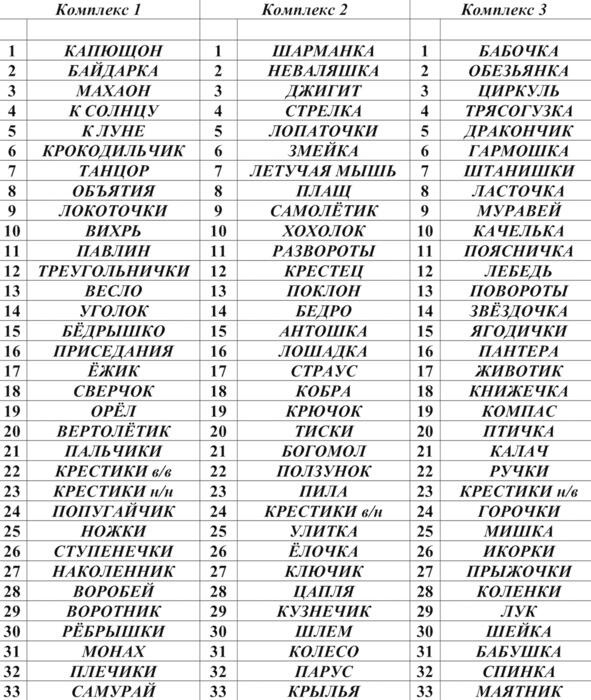Последовательность выполнения упражнений при выполнении какого-либо из трёх комплексов по 33 упражнения каждый, следует определить для себя индивидуально, в зависимости от ваших особенностей и предпочтений.