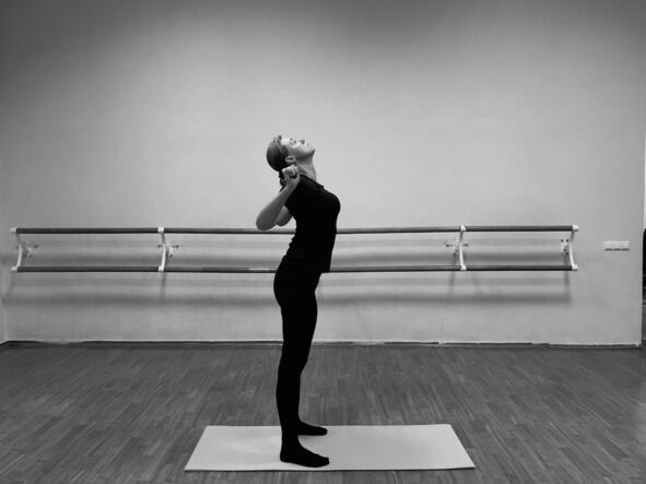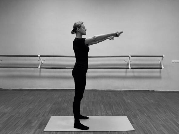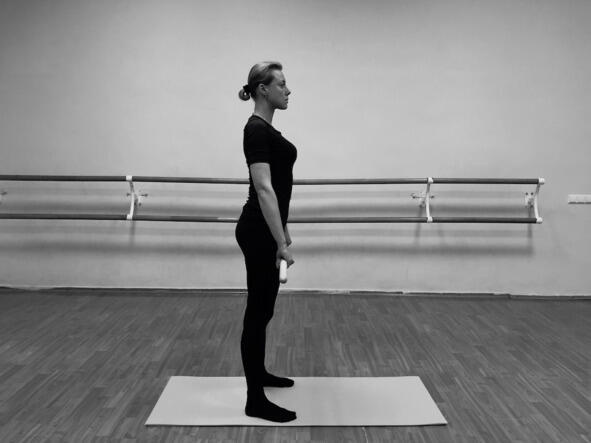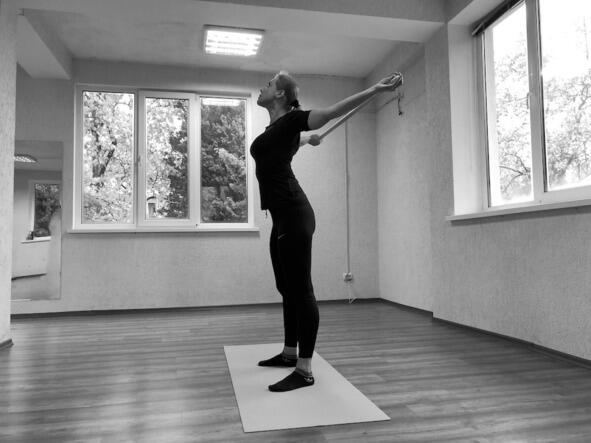 Техника выполнения: заводим виргу назад за голову прямыми руками до уровня лопаток. Голова поднята вверх. Выполняем движения лопатками и плечами, словно выписывая «волны» или «восьмёрочки», и сохраняя руки прямыми (движение 1). Движения плавные. Постепенно сужаем руки до среднего хвата. 5 повторений.