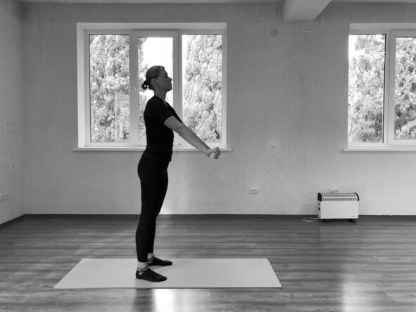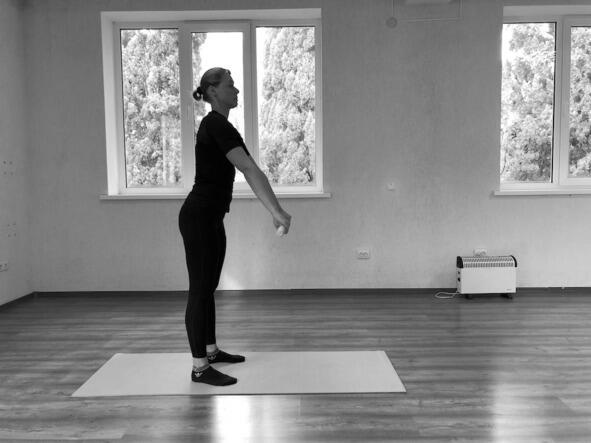 Техника выполнения: поднимаем виргу вверх и тянем её к потолку, а плечи к ушам (визуально подымается вверх область плеч) (движение 1) в течение 5 секунд. Возвращаемся в исходное положение. 5 повторений.