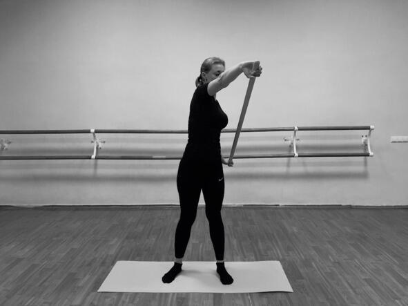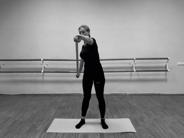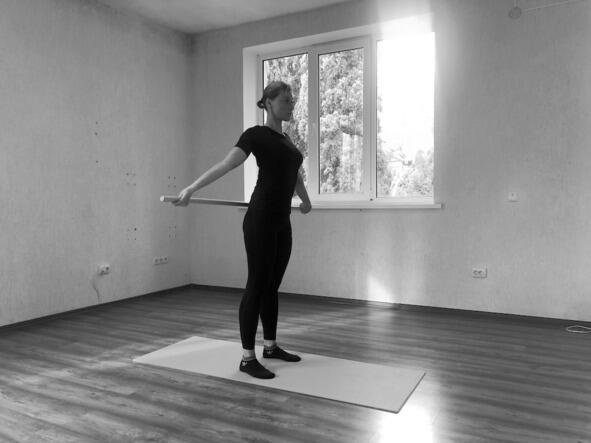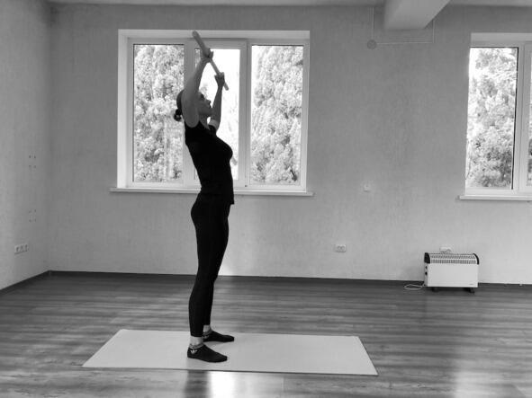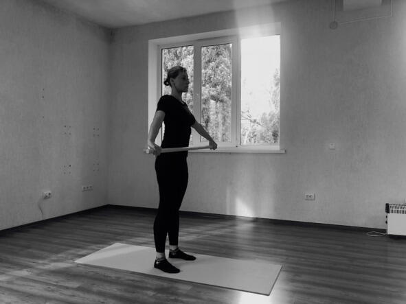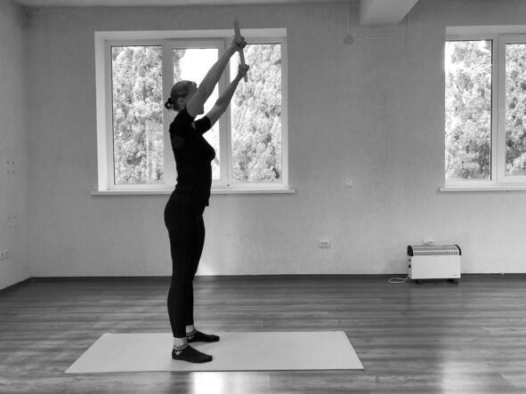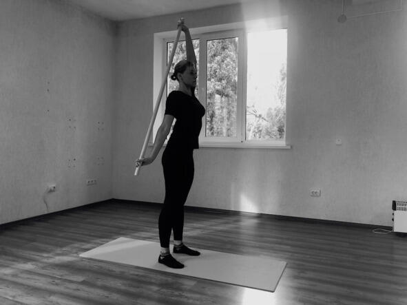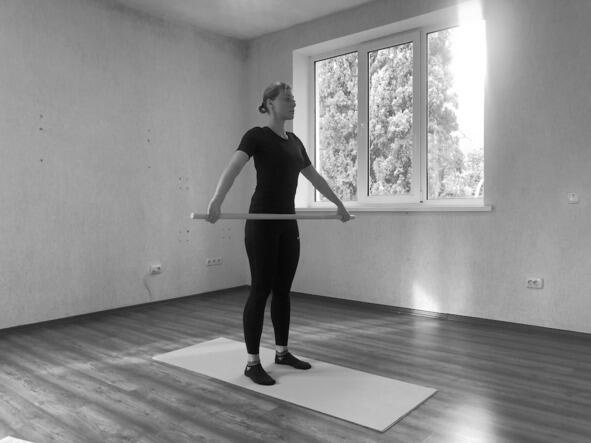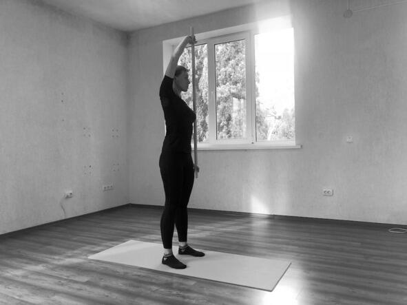 Техника выполнения: заводим виргу за голову прямыми руками, раскрывая грудную клетку, задерживаем на уровне лопаток на несколько секунд и опускаем затем на поясницу прямыми руками (движение 1). Голова при этом поднята вверх. Возвращаем виргу прямыми руками в исходное положение. Постепенно сужаем руки до среднего хвата. Движения плавные. 5 повторений.