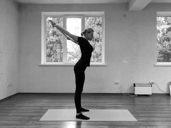 Исходное положение: стоя, ноги на ширине плеч, вирга над головой в прямых руках, хват средний верхний.