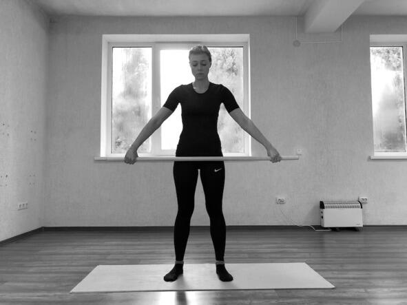 Исходное положение: стоя, ноги на ширине плеч, вирга перед собой на уровне шеи лежит на раскрытых ладонях, хват средний.
