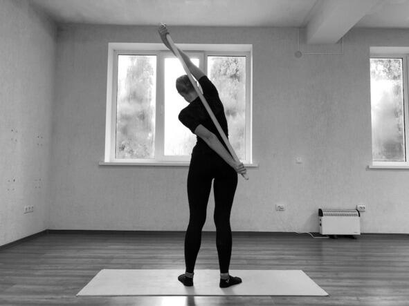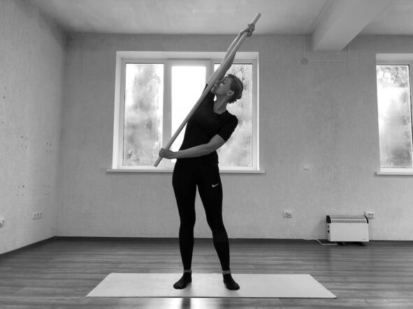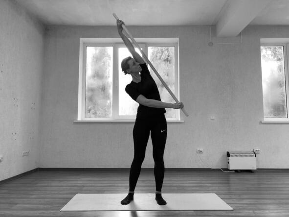 Техника выполнения: наклоняем туловище вправо и ведём виргу прямой правой рукой влево вверх, подымая левую руку и растягивая её в плечевом суставе, а также растягивая левую боковую поверхность туловища. Шея расслаблена, голова опущена вправо. В верхнем положении выполняем давление правой рукой на левую снизу вверх в течение 5 секунд (движение 1). Возвращаемся в исходное положение. Наклоняем туловище влево и ведём левую руку с виргой вправо вверх, подымая правую руку (движение 2). Движения плавные. 6 повторений.