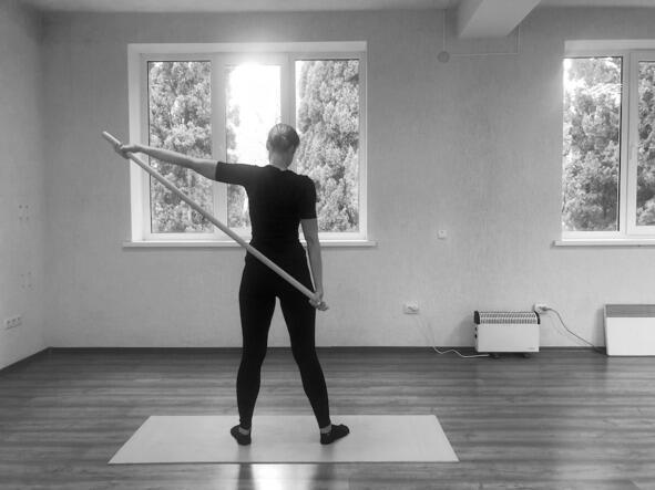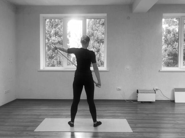 Техника выполнения: поднимаем виргу максимально вверх за спиной и фиксируем её в данном положении, приняв его за нижний уровень (положение 1). Выполняем короткие рывковые движения руками вверх из положения 1 и обратно (рывки). Движения резкие. 20 повторений. Далее, из положения 1 выполняем повороты туловища влево и вправо, стопы не отрываются от пола. Движения плавные. 10 повторений.