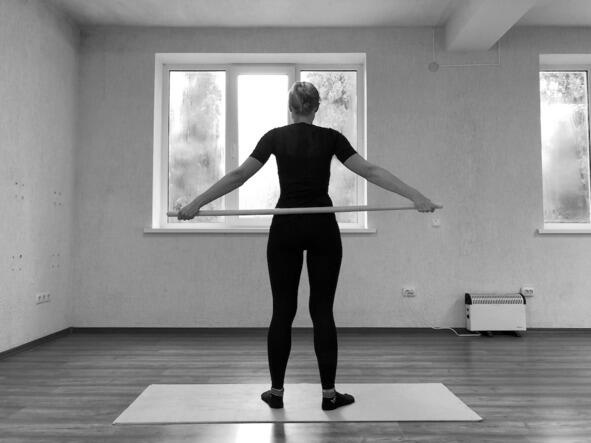 Исходное положение: стоя, ноги на ширине плеч, вирга за спиной в опущенных руках, хват широкий нижний.