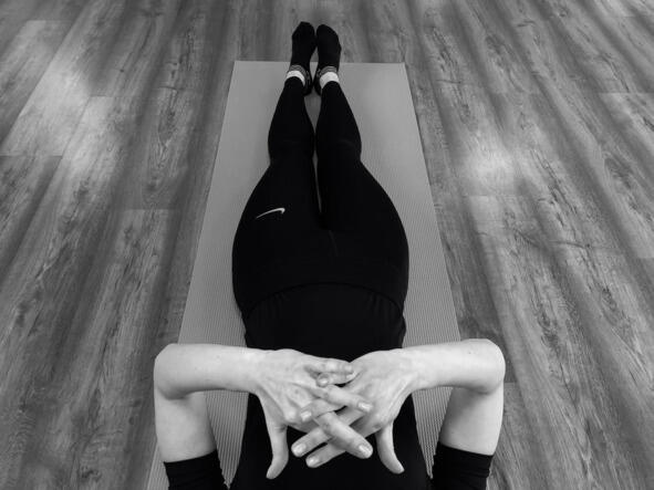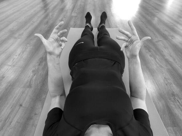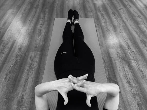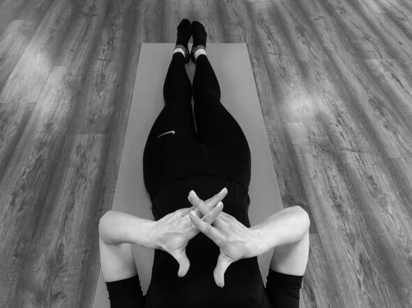 Исходное положение: лёжа на спине, руки приподняты над животом, большой палец правой руки отведён в сторону, ладонь левой руки наложена на большой палец правой руки сверху него.