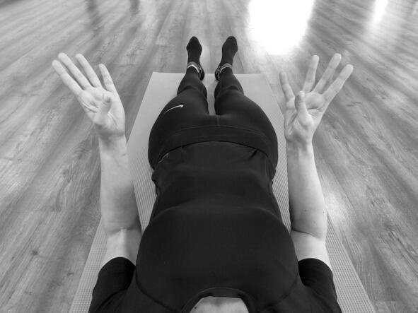 Исходное положение: лёжа на спине, руки приподняты над животом, пальцы обеих кистей сложены между собой, соприкасаясь в области средних фаланг (проксимальных межфаланговых суставов); прямые большие пальцы рук соприкасаются подушечками между собой.
