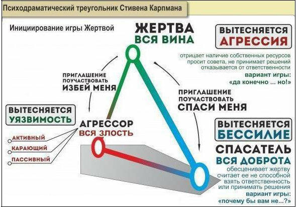 Например, отказываясь принимать ответственность, мы попадаем в позицию Жертвы. А пытаясь помочь человеку против его воли в позицию Спасателя. Из нее потом почти неизбежно вылетаем в роль Агрессора, так как спасаемый по своей природе часто спасаться не хочет, чем вызывает гнев, раздражение и преследование.