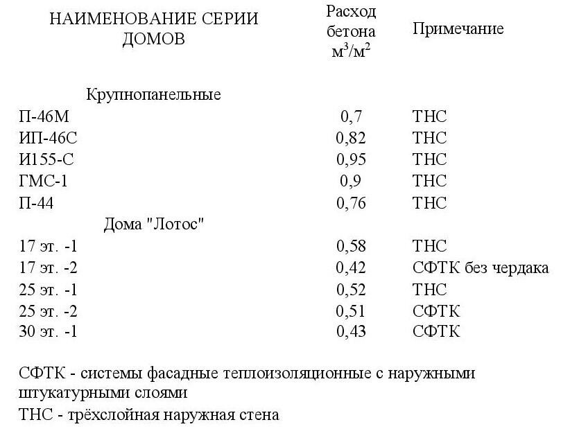 Таблица расхода бетона на один квадратный метр продаваемой площади для различных типов домов
