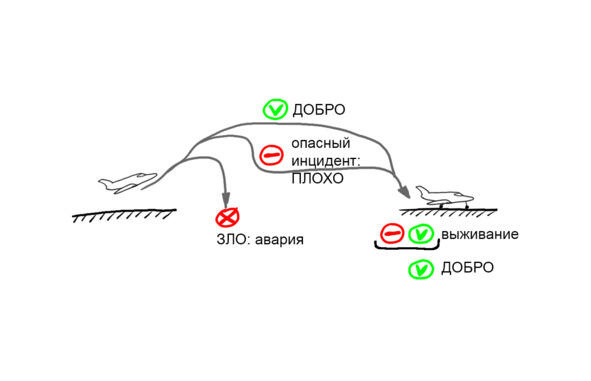 Рис. 5. На рисунке «выживание» соответствует и «хорошему» и «плохому с аварией» полету. Таким образом, «добро и зло» не соответствует «выживанию», а выражает отношение к «проблеме гибели», которая и дает оценку «плохо» полету с аварией.
