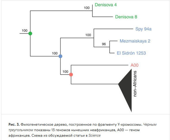 Филогенетическое дерево, построенное по фрагменту Y-хромосомы. Чёрный треугольник 13 геномов современных неандертальцев; А00 геном африканцев (Y-хромосомная гаплогруппа А00) [226]
