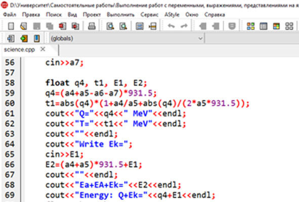 Код 4.2.1. Код для вывода энергии продуктов ядерной реакции