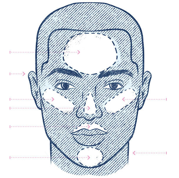 Ваше лицо это сетка, по которой нужно расставить акценты. Самый простой способ понять, какие участки кожи выделяются естественным образом, поместить лампу сверху и посветить вниз. Так вы увидите светлые и темные зоны. У некоторых людей скулы более выражены, чем у других. «Найдите выдающиеся участки лица», советует Нгуен. Популярные места для использования хайлайтера «скулы, переносица, зона над надбровной костью, уголки глаз, где находятся слезные каналы, верхняя часть лба и центр подбородка». В качестве бонуса: уши! «Я люблю наносить хайлайтер на уши, а также на шею, чтобы все выглядело ровно». Проведите по верхушкам ушей и по боковым сторонам шеи везде, куда падает свет.