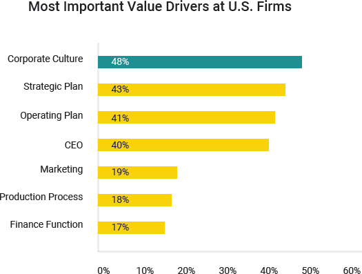 Университет Дьюка в США провел опрос среди почти 2000 топ-менеджеров крупнейших компаний, с целью выявить основные факторы, повышающие ценность компании. Как видим, на первом месте стоит корпоративная культура.