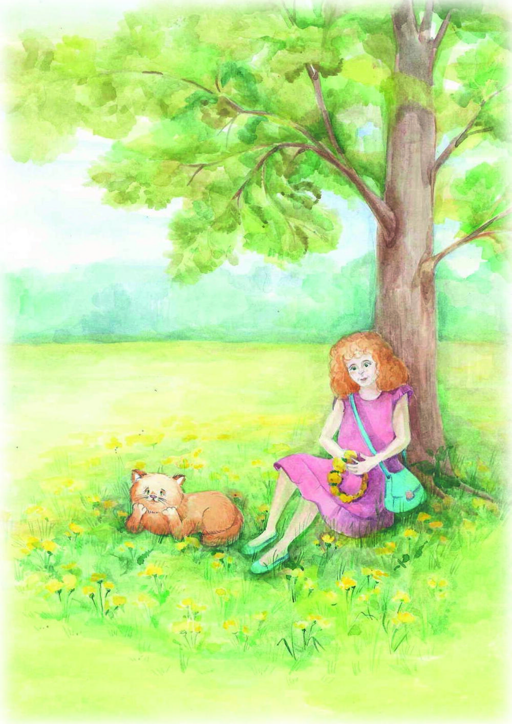 Юля собирала вокруг себя одуванчики и делала из них венки один для своего пушистого друга, а второй для себя. Жёлтых цветков было столько, что Юле даже не приходилось вставать, чтобы набрать необходимое количество одуванчиков для своей поделки.