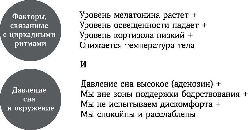 Таким образом, лучшее время ложиться спать когда давление сна высокое, а циркадные ритмы посылают нашему организму правильные сигналы, например: