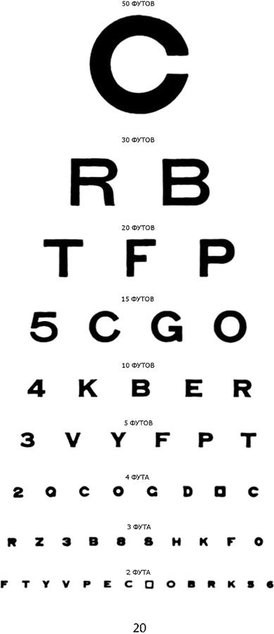 5. Отойдите на расстояние десяти футов (ок. 3 метров прим. перев.) от таблицы и читайте то, что cможете увидеть, без усилия или напряжения. Над каждой строкой букв располагаются маленькие цифры, обозначающие расстояние, с которого их может увидеть нормальный глаз. Над большой буквой «С» вверху таблицы расположено число «200». Следовательно, большая буква «С» должна быть прочитана с расстояния двухсот футов. Если вы можете прочитать эту строку только с расстояния десяти футов, то острота вашего зрения 10/200. Числитель дроби всегда обозначает расстояние от таблицы до глаз. Знаменатель всегда равен числу над строкой. Если вы способны прочитать только строку, обозначенную числом «40», то ваше зрение 10/40.