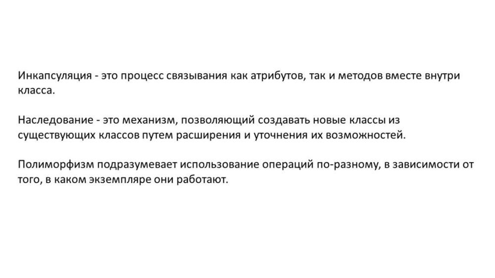 Полиморфизм в объектно-ориентированной парадигме подразумевает использование операций по-разному, в зависимости от того, в каком экземпляре они работают.