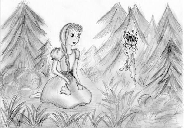 Кто здесь? подскочила девочка, испуганно озираясь по сторонам. Тут она увидела перед собой огромную каплю дождя, что робко выглядывала из-за широченного ствола дерева. Капля то плавно стекала вниз, то, принимая форму сосульки, вновь поднималась вверх, издавая при этом звук, очень похожий на журчание воды.