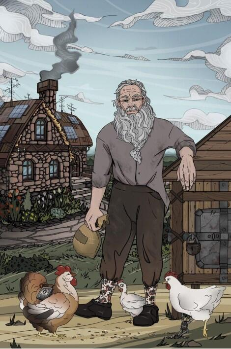 Посередине поляны был вырыт небольшой колодец, накрытый дощатой крышкой с люком для спуска ведра. Справа от колодца находился курятник с большой дверью, закрытой на внушительный металлический замок. Возле курятника стоял дед Оберон, одетый в серую рубашку, запачканную землей, длинные мешковатые штаны, заправленные в шерстяные носки и специальные резиновые ботиночки Роби знал, что в древности их называли «галоши». Седые, до плеч, волосы деда поблескивали на солнце, а кудрявую бороду он собрал в хвостик.