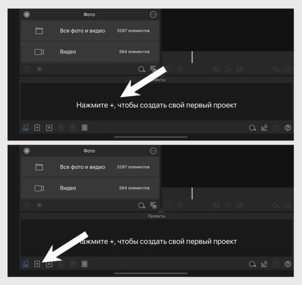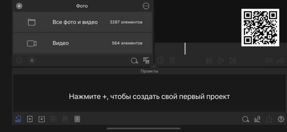 Чтобы это сделать, можем тапнуть либо по большой надписи «Нажмите +, чтобы создать свой первый проект» (эта надпись, к слову, будет видна лишь при первом запуске приложения. В дальнейшем тут будут отображаться ваши ранее созданные проекты, к которым можно будет вернуться), либо по небольшой иконочке плюса в нижнем левом углу экрана (рис. 4).