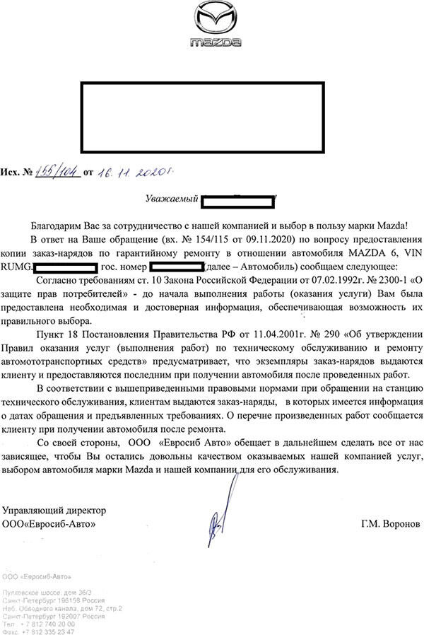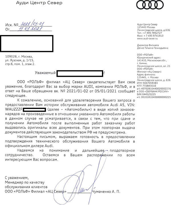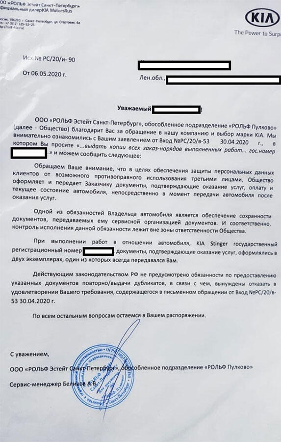 Вот вам минимум три письма от трех разных клиентов, в которых как под копирку дилеры отказываются предоставить документы (заказ-наряды), которые клиенты по незнанию не взяли сразу.