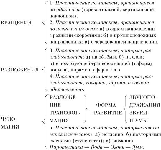 Ткани, зеркала, тонкие металлические листы, цветная фольга, любые яркие и пёстрые материалы. Механические и электротехнические устройства; музыкальные и шумовые; разноцветные светящиеся химические жидкости; пружины; рычаги; трубы и т. д. Из этих материалов мы можем сконструировать: