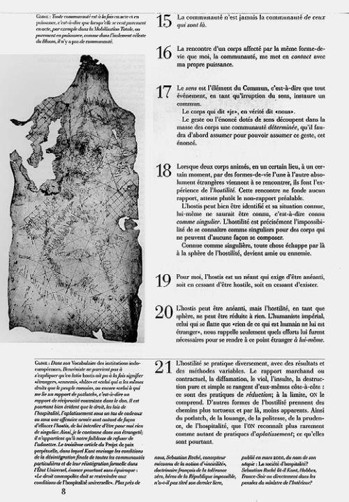 примечание α: Сообщество всегда подразумевает не группу тел в отрыве от окружения, а определённую природу отношений тел между собой и тел по отношению к их окружению. Как только сообщество хочет оформиться в отдельный субъект, в самостоятельную реальность, хочет материально воплотить границу между внешним к ней и внутренним, она наталкивается на собственную невозможность. Эта невозможность и определяет сообщество. Тотальное самосознание[15] сообщества общность совпадает с полным распадом всякого сообщества на уровне единичных отношений, когда отсутствие сообщества становится ощутимым.