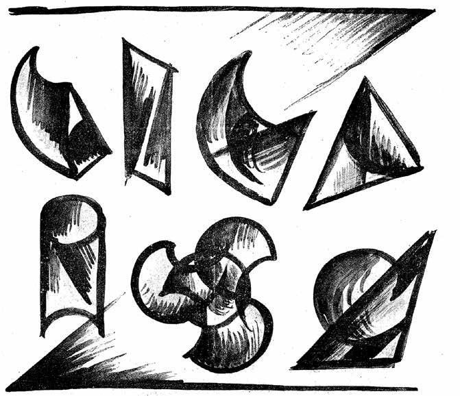 3. Динамичной, благодаря динамичным рисункам и расцветке ткани (треугольники, конусы, спирали, эллипсы, круги), которые внушат любовь к опасности, к скорости и к натиску и ненависть к миру и к неподвижности.