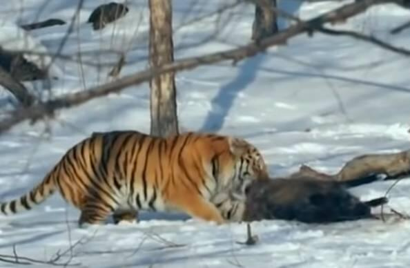 Произошло это примерно чуть более суток назад. Тигр выследил небольшое стадо кабанов, скрал его и залег на предполагаемом пути движения. Атаковал из засады кабаны, двигавшиеся цепочкой, «чухнули», по выражению Николая, веером в рассыпную. Но тигр, видимо успел схватить зазевавшегося молодого кабанчика.