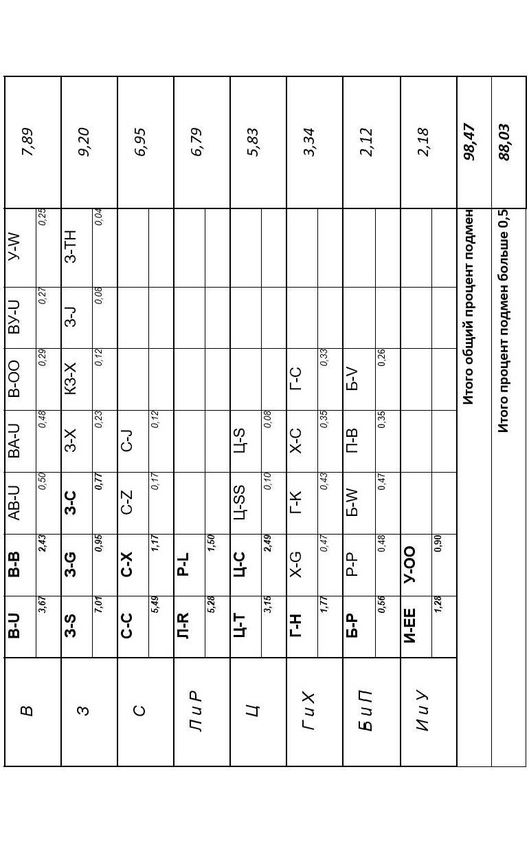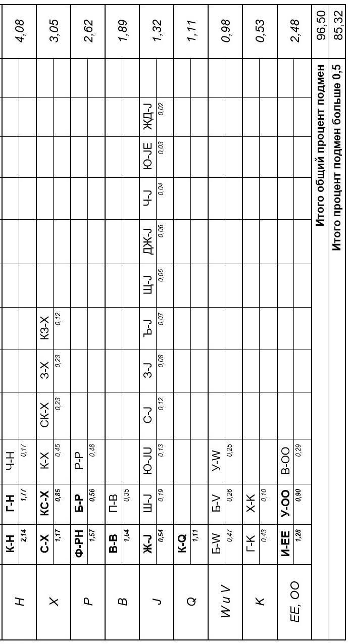 Замечу, что этот вариант таблицы, на мой взгляд, не подходит для взлома, зато, отлично классифицирует шипящие буквы, показывает объём урона, нанесённый языку и даёт нам удобный инструмент для дальнейшего анализа. Вы только взгляните! 13,44 процентов от всех подмен заняли шипящие!