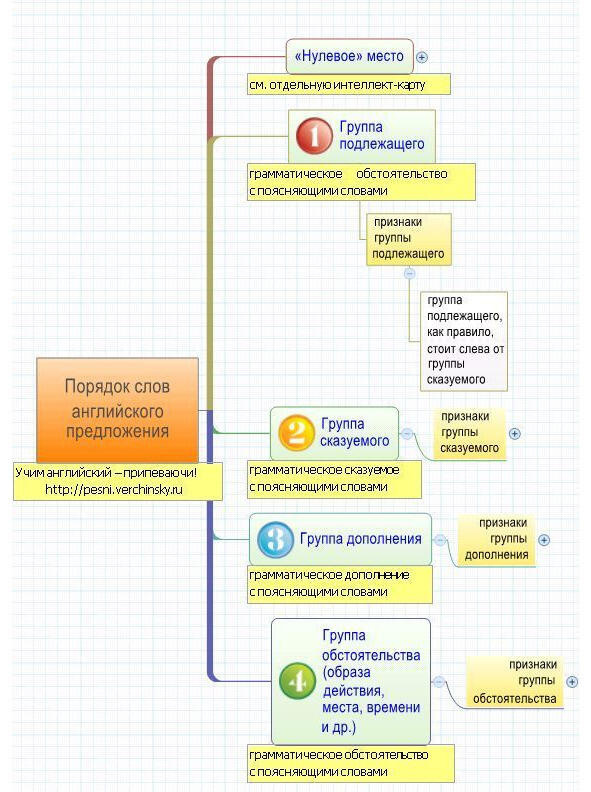 Таким образом, техника анализа простого предложения сводится к разбору предложения на эти первые, вторые и так далее места с последующим соотнесением с синтаксическими ролями (см. интеллект-карту «Порядок слов английского предложения» из другой книги автора «Английский синтаксис в интеллект-картах. Часть 3: порядок слов в предложении»).
