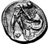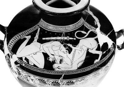 В VIV веках до н. э. наиболее востребованными были два типа изображений этого момента: на одном сцепившиеся Геракл и лев почти распластаны на земле (ил. 13), на другом оба стоят (ил. 14).