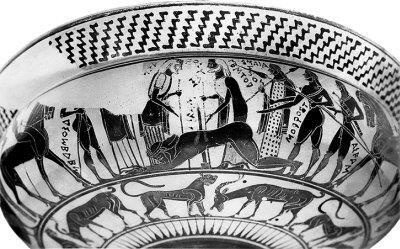Художники также часто выбирали кульминационный момент в истории о самоубийстве Аякса. Он был одним из величайших греческих героев, сражавшихся против троянцев. В Илиаде Гомера говорится, что он «уступал только Ахиллу». Когда Ахиллес погиб, его мать, Фетида, предложила отдать необыкновенные доспехи сына «лучшему из греков после Ахилла». Аякс небезосновательно предполагал, что эту награду получит он, но, к его удивлению, появился еще один претендент. Им оказался Одиссей, который в конце концов хитростью и уговорами заполучил доспехи. Аякс был потрясен и унижен таким исходом. Жить с уязвленной гордостью он не мог и нашел единственный для себя достойный выход: броситься на собственный меч. На чернофигурной коринфской чаше (ил. 18) огромное тело Аякса простерто на земле. (Собственно, он был знаменит своим могучим телосложением.) Под ним видна рукоять его меча, клинок выступает из спины. Абсолютно ясно, что произошло. У подошедших к мертвому телу потрясенных греческих военачальников, чьи имена указаны рядом, нет никаких сомнений в этом.