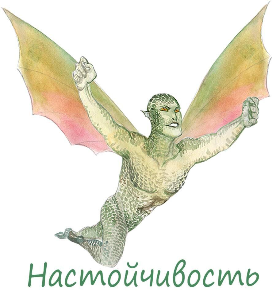 Но самое большое впечатление на ребят произвела Настойчивость высоченное мускулистое существо, похожее на человека. Тело существа покрывала змеиная кожа с серебристо-зеленым отливом. Расправив мощные крылья и подняв руки в знак победы, существо взмывало ввысь. Ребята обратили внимание на обращенный вверх взгляд и победоносную улыбку существа.