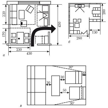 Рис. 2. Функционально-планировочная организация общей жилой комнаты: а) примеры планировочной организации; б) общие комнаты сложной формы; в) зона просмотра телевизора