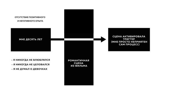 Давайте вернемся к ТН неопытности. Даже если десятилетний мальчик, увидевший на экране сцену поцелуя, съежится в отвращении, это будет лишь мимолетная детская реакция, которая тотчас забудется. Все потому, что это событие не находит отклика в прошлом, как позитивного, так и негативного. Юный зритель лишь мимолетно среагирует на непонятное для него явление, однако в силу того, что сопоставить это явление с собственным опытом не представляется возможным, реакция хоть и будет негативной, но в то же время абсолютно пустой:
