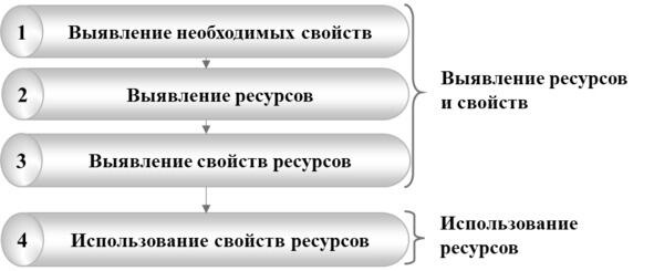 Для решения задачи или развития системы прежде всего необходимо определить свойства системы, которые должны быть улучшены. Затем выявить ресурсы, обладающие данными свойствами. Для этого определяют все свойства имеющихся ресурсов. В заключении используют необходимые свойства для решения задачи или развития системы.