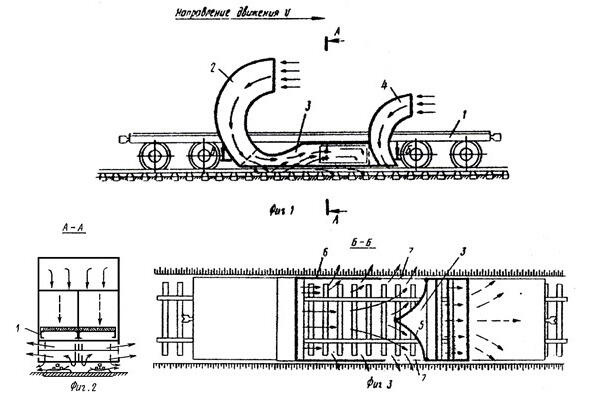 Очистку железнодорожных путей можно проводить набегающим на локомотив потоком воздуха, направляя его в нужное место с помощью специальных экранов и отверстий (рис. 1.65). Каждый локомотив может быть снабжен при изготовлении таким приспособлением (а. с. 1 054 483). Тогда железнодорожные пути не нужно будет специально очищать. Не нужны затраты на специальный локомотив, не нужен обслуживающий персонал и время на ожидание, когда пути будут очищены.