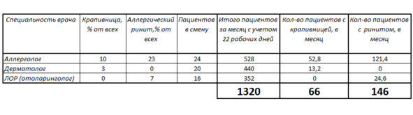 Для того, чтобы понять, много это или мало в пациентах, надо знать поток, который проходит через специалиста за какой-то определенный период времени. По существующим нормативам, утверждённым МЗ 690-р в 2011 году, например, в СПб, в смену аллерголог принимает 24 человека, дерматолог 20, а ЛОР 16. Нормативы постоянно пересматриваются, недавно их снова пересмотрели, введены нормативы на одного пациента в минутах, но для понимания подхода приведённых мною данных вполне достаточно. Для себя примем, что врач работает в этом месяце 22 рабочих дня.