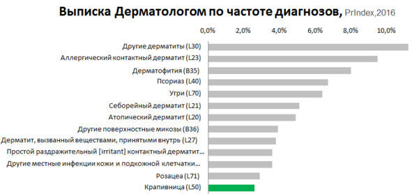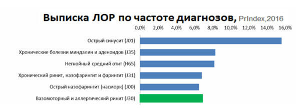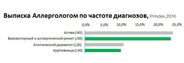 Давайте посмотрим материалы аналитического продукта под названием Prindex компании Ipsos Healthcare. Данные 2016 года взяты мною исключительно в качестве примера для демонстрации возможностей рекомендуемого инструмента. Посмотрим, какие диагнозы чаще всего встречаются в практике аллерголога, дерматолога и ЛОРа. Естественно, нас интересуют, в первую очередь, те диагнозы, которые значатся в инструкции у нашего нового антигистаминного препарата.