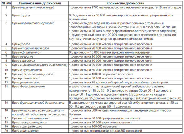 Приказ Министерства здравоохранения и социального развития РФ от 15 мая 2012 г. 543н «Об утверждении Положения об организации оказания первичной медико-санитарной помощи взрослому населению» описывает нормативы для введения ставок амбулаторных врачей: