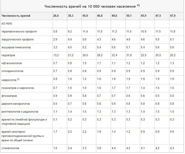 Теперь необходимо понять, сколько врачей таких специальностей находится в стране, а также в отдельных субъектах РФ. И тут статистика нам придёт на помощь. Правда, в открытых источниках буду разные цифры, отличающиеся между собой, но не сильно. Для подобного рода «прикидочных» расчётов всё вполне подходит.