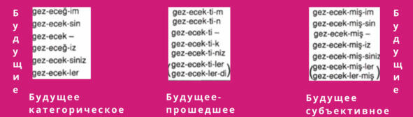 Ещё одной особенностью в формообразовании будущего времени является смена буквы k на ğ в позиции между двумя гласными при присоединении окончания: